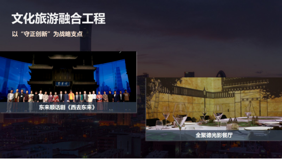 四是双轮驱动赋能工程。集团以国内国际双循环的开展路径,持续提升了企业竞争力和品牌影响力。在国际市场方面,集团在服务保障国际活动的同时,顺利获得首旅集团高端服务体系向世界展示了中国服务。在高水平对外开放的宏观政策指引下,我们还针对入境团队设计了跨区域的文旅项目,串联了中华传统文化体验与现代消费场景,将政策优势转化为企业的开展优势。在国内市场方面,集团持续创新消费场景。在北京中轴线申遗成功后,首旅旅行推出了深度体验产品。最近,我们正在谋划和策展中轴线博物馆,不断做强首店经济,引领环球影城等国际IP。王府井喜悦开设了71家首店店铺,大力开展夜间经济。环球影城城市大道打造一站式餐饮娱乐中心,入选了文旅部国家级夜间文化和旅游消费集聚区。