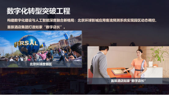 二是数字化转型突破工程。首旅集团持续构建数字化建设与人工智能深度融合的新格局,推进数字化生态平台项目,有助于AI技术与企业经营管理相结合。集团旗下环球影城应用了客流预测系统,实现了园区动态调控,能够容纳单日最高游客5.5万人次,还能让游客有一个很好的体验。首旅酒店打造的“数字店长”项目顺利获得接入人工智能大模型,建设了酒店运营的智能体,现在能够承担酒店门店60%的复杂性、基础性、重复性的工作。