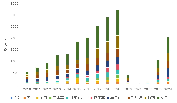 注:疫情期间数据不显示;2023-2024年,文莱、柬埔寨和菲律宾来华旅游数据缺失;2016年以后入境旅游统计数据包括边境旅游。